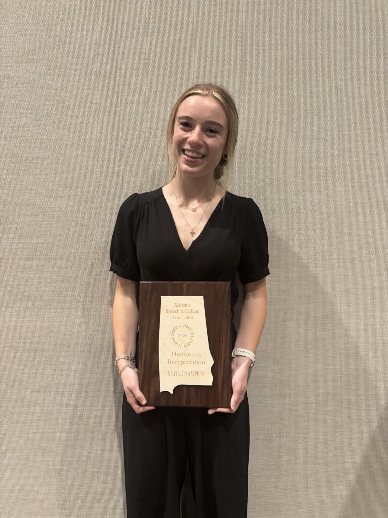Evelyn Cummings placed first in Humorous Interpretation which qualifies her to compete in the National tournament in Richmond, Virginia this summer. Evelyn was also selected as Alabama’s 2026 Student of the Year for Speech and Debate and has received the Alabama’s District nomination for the National Student of the Year for Speech and Debate which will be decided later this summer.